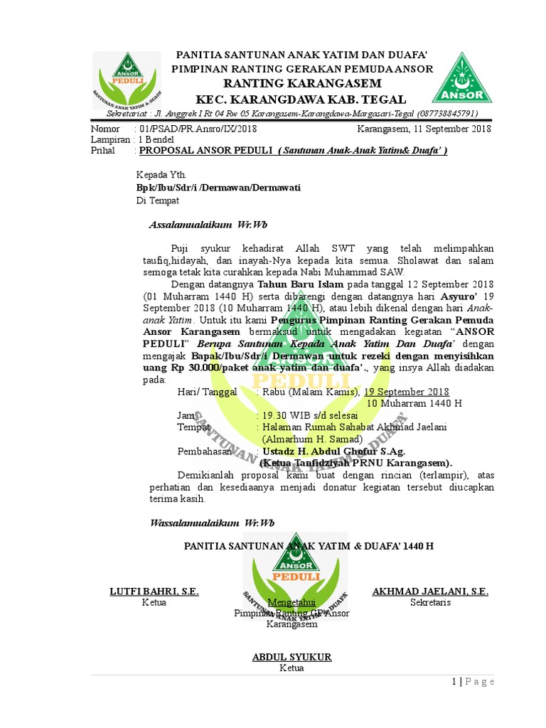 Proposal kegiatan ramadhan 1437 h alpha indonesia foundation. Santunan anak yatim dan dhuafa 3. Nilai nominal setiap paket adalah rp. Kampung penclut rt.01 rw.03 desa sirnagalih kec. Pendahuluan kesadaran kita untuk saling berbagi, tidak saja merupakan sikap mulia yang diajarkan agama. Proposal panti asuhan arif rahman hakim sby. Proposal santunan anak yatim & dhuafa. Proposal santunan anak yatim panitia santunan anak yatim. Lebih jauh dari itu, pikiran dan naluri manusia sebagai makhluk sosial selalu menuntut kita untuk bersikap. Pemuda yasin tahlil ajibarang kulon. 0823 9296 1008, zul zalfri : Latar belakang perkembangan dan moderenisasi zaman adalah suatu hal yang tidak bias kita hindarkan. Kesadaran kita untuk saling berbagi, tidak saja merupakan sikap mulia yang diajarkan agama.