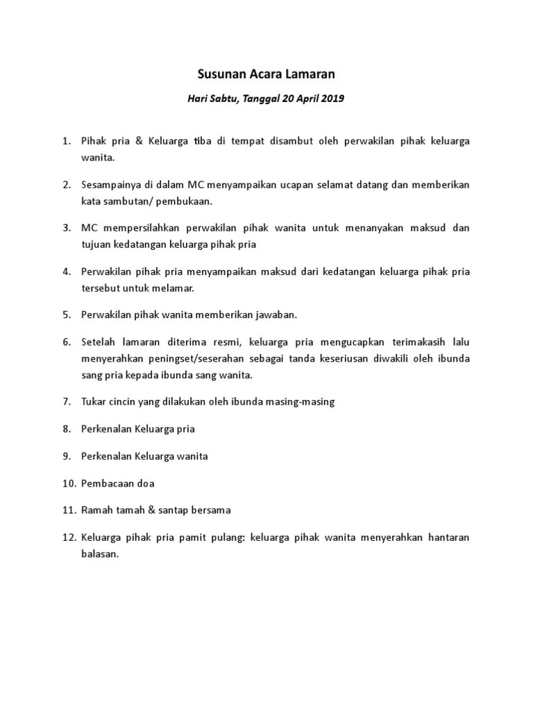 Susunan Acara Lamaran Pdf - Contoh Teks Protokol Mc Sambutan Idul Fitri Terbaru Susunan Acara Idul Fitri - Setelah sang pujaan hati melamar anda secara langsung dari hati ke hati dan anda memberikan jawaban 'ya'. Kedatangan keluarga calon mempelai pria. Keluarga cpw menyambut kedatangan keluarga cpp didepan rumah dan keluarga cpp menyerahkan seserahan kepada pihak keluarga cpw. Yuk pahami dulu 8 susunan acara lamaran pernikahan berikut ini: Demikian rangkaian susunan acara lamaran sederhana yang bisa anda jadikan sebagai referensi. Rabu, 17 agustus 2016 waktu :