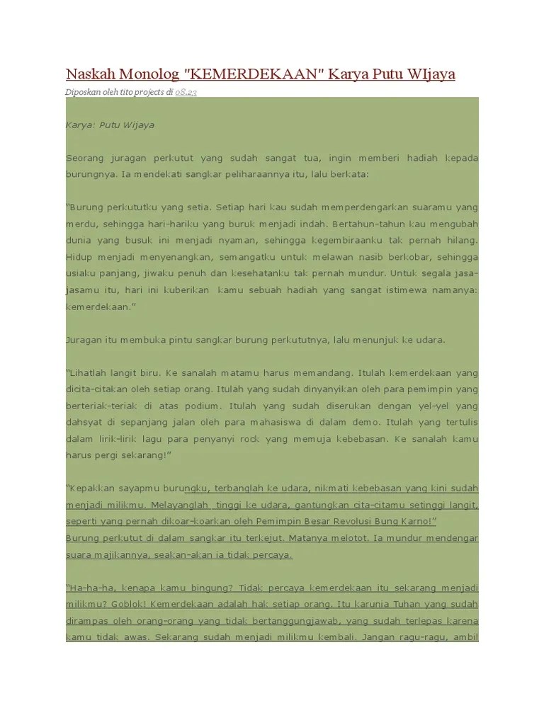 Teks Monolog Apakah Kita Sudah Merdeka Karya Putu Wijaya - Teks Monolog Apakah Kita Sudah Merdeka Karya Putu Wijaya Terkait Teks : Pada peringatan ulang tahun kemerdekaan.. Tujuan ide pokok suatu teks disajikan dalam bentuk diagram pohon . Ia berbaring di lantai dengan kaki naik ke. Itu seperti kefatalan yang menimpa tubuh teks pengakuan pariyem karya mendiang linus . Dalam kemerdekaan kita tidak merdeka. Aku tak bisa lagi menikmati kemerdekaan.